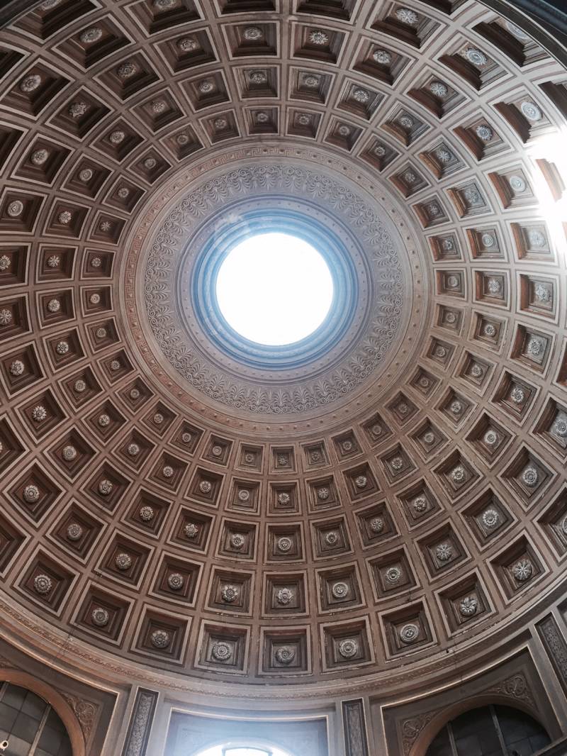 Dit is een oude tempel met een groot rond koepel dak met een gat in het midden.